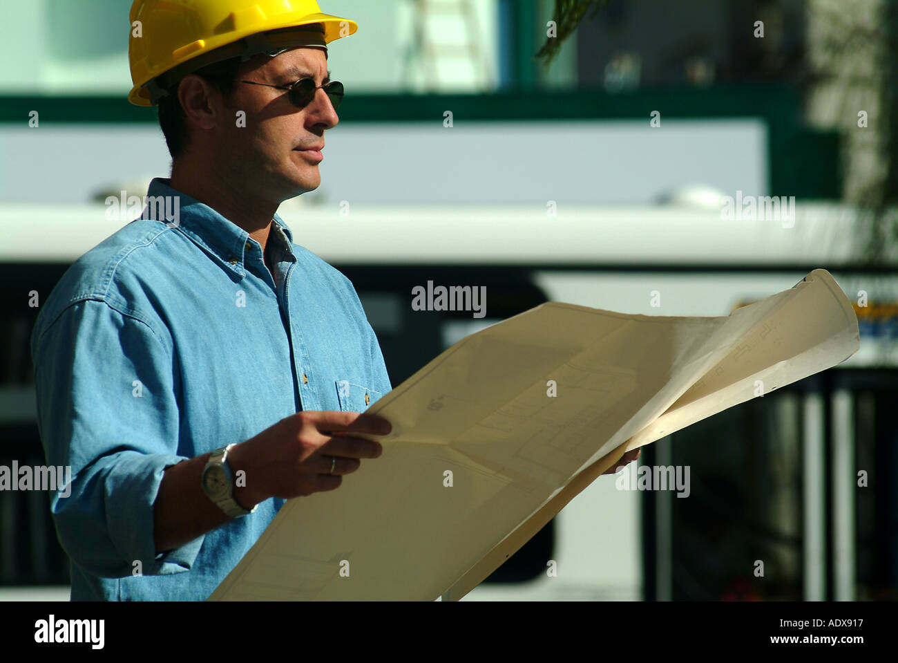 Architecture Architect Holding Blueprint Project Diagram Scheme Helmet Yellow Sunglasses Adult Male Person People 30 40 Stock Photo Alamy